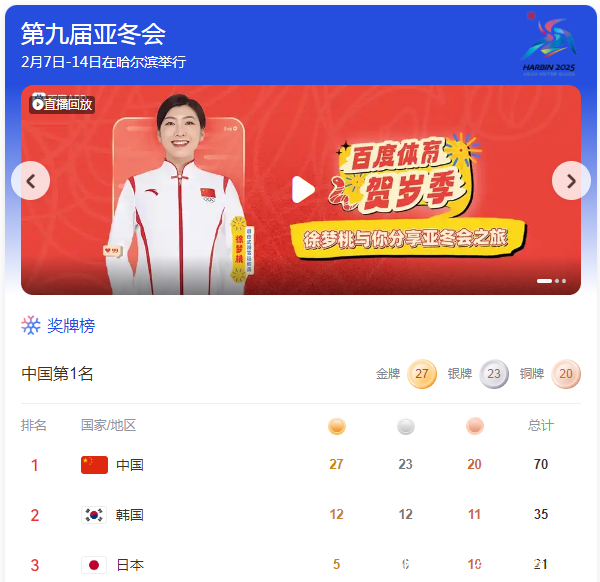 北京本领2月12日音问,2025年第9届亚洲冬季通顺会延续进行。第四个比赛日末端后,中国代表团以27金23银21铜延续高居第一位,韩国代表团以12金12银11铜排在第二,日本队以5金6银10铜排在第三。